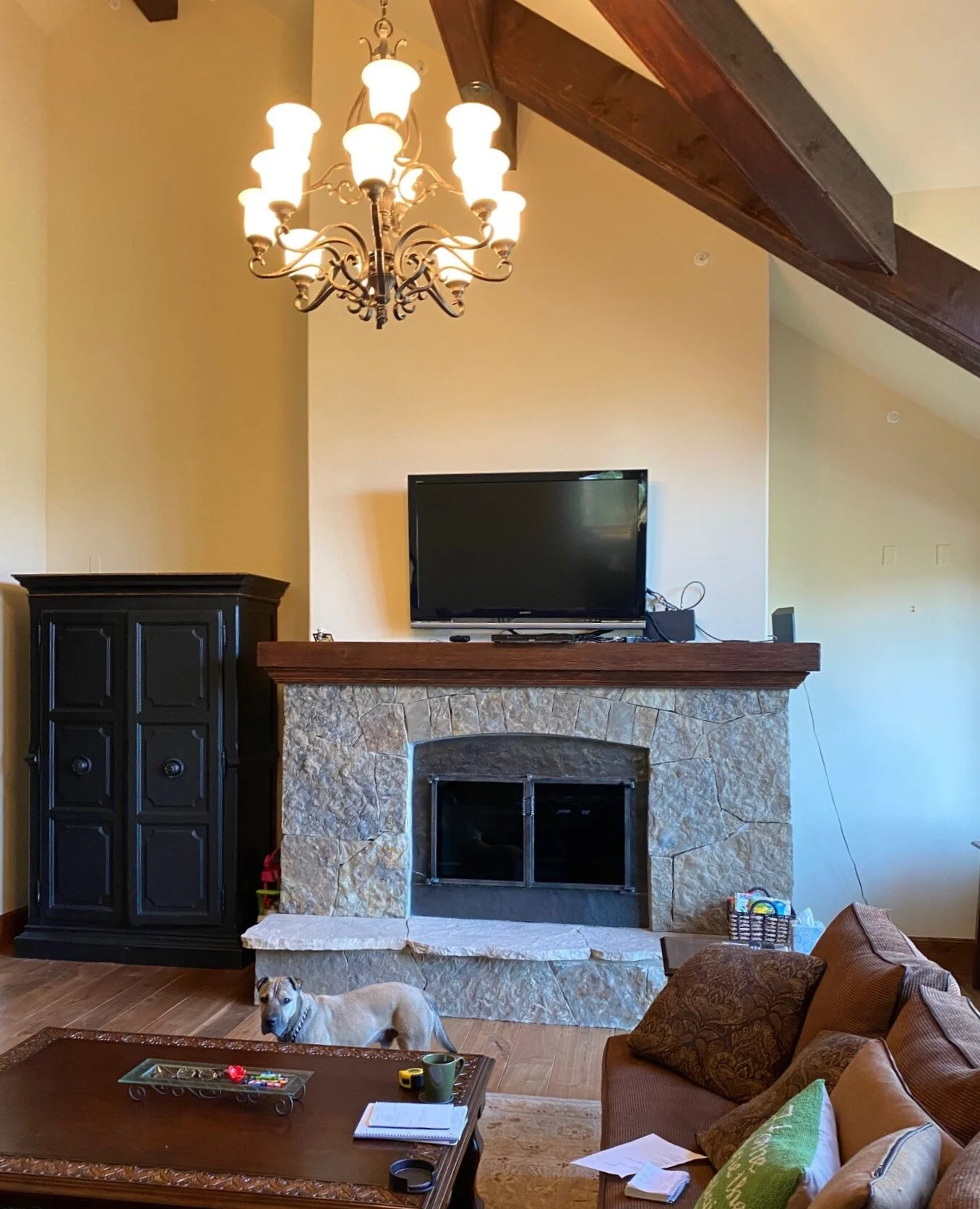 tv next to fireplace cathedral ceiling
